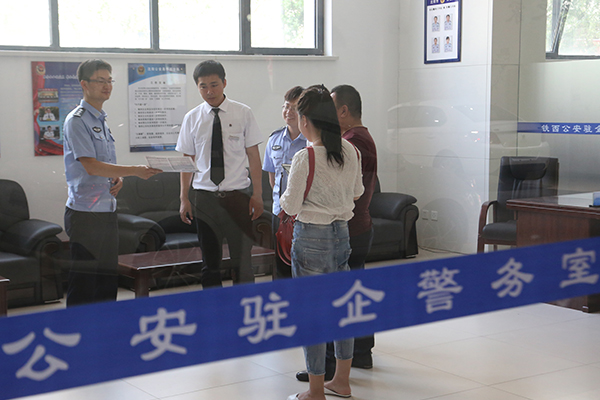 駐企警務(wù)室民警在現(xiàn)場發(fā)放和講解《關(guān)于改進(jìn)和規(guī)范公安派出所出具證明工作的意見》新規(guī)定