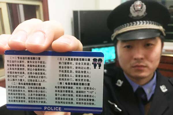 日前,丹東市公安局大孤山經(jīng)濟(jì)區(qū)分局黃土坎派出所把防范“盜搶騙”知識(shí)制成安全卡片,向轄區(qū)群眾發(fā)放,增強(qiáng)廣大群眾的防范意識(shí)。