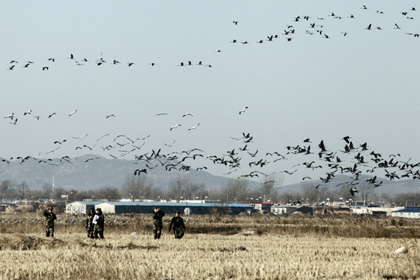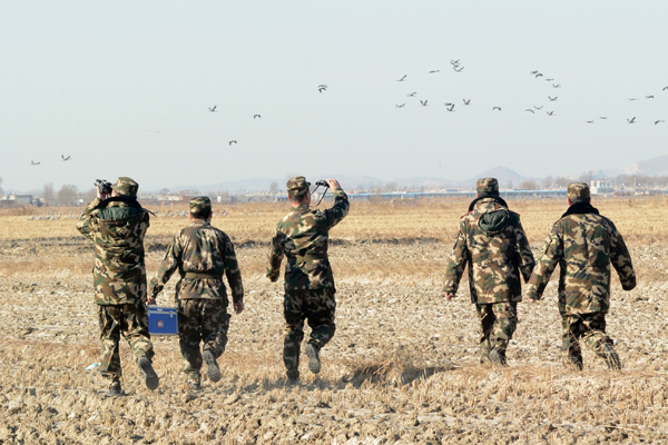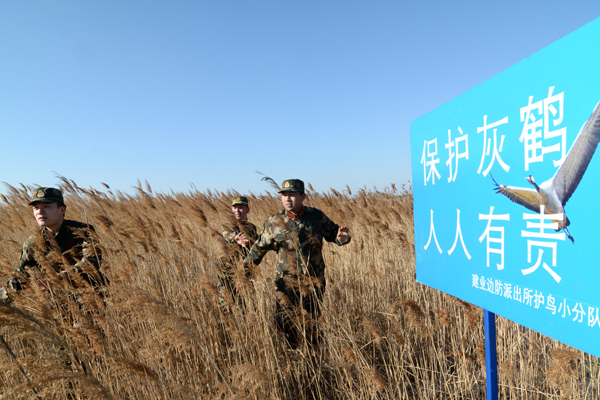 遼寧省渤海灣濕地錦州市轄區(qū)由于退耕還林濕地環(huán)境改善,因氣候變暖,今年3000余只灰鶴候鳥變留鳥,留守這里越冬不再南遷。為保護這些“嘉賓”,錦州市邊防支隊凌海大隊建業(yè)邊防派出所在警力不足情況下,成立愛鳥護鳥小分隊,每天巡護在灰鶴棲息地,風雪無阻、與鳥為伴,成為渤海灣濕地護鳥人,為這些候鳥營造出安全的棲息環(huán)境。這里也成為了國家二級保護動物——灰鶴越冬的樂園。