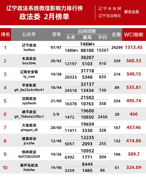 2023年2月份遼寧政法微信影響力排行榜