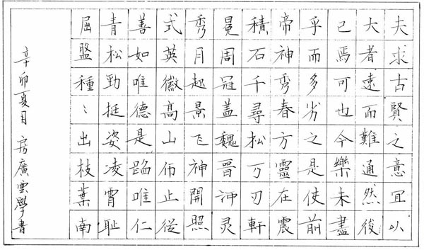 一個(gè)周五的下午,記者依約來(lái)到房廣云的工作單位——大連市西崗區(qū)人民檢察院。握手的瞬間,記者就深切體會(huì)到了他的熱情和堅(jiān)毅,眉宇間透著股英氣。坐在他整潔的辦公桌前,記者和他攀談起來(lái):“你的同事都說(shuō)你特別鐘愛(ài)楷書(shū),是什么使你鐘情于她的呢?”房廣云答道:“其實(shí)我喜歡上楷書(shū)書(shū)法,有一個(gè)逼迫自己就范到逐漸迷戀的過(guò)程,這和我從事檢察工作的經(jīng)歷有密切關(guān)系。我剛剛走上工作崗位的時(shí)候,是在反貪局,那時(shí)候幾乎天天需要外出調(diào)查,人也變得很浮躁,為了使自己‘定’下來(lái),我逼迫自己開(kāi)始練習(xí)楷書(shū)。后來(lái)從事案件審查起訴工作,案頭整天堆滿了卷宗材料,為了調(diào)劑一下工作的枯燥,每每拿起筆來(lái),隨手寫上幾筆楷書(shū),煩躁心情即刻消散。楷書(shū)法度,筆落莊重,戒驕戒躁,沉淀沉靜。自此,我深深喜愛(ài)上了楷書(shū)書(shū)法。”
